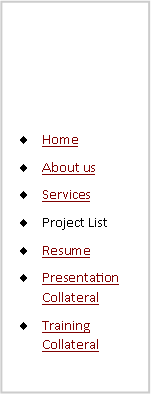 Home | About Us | Services | Project List | Resume | Presentation Collateral | Training Collateral |